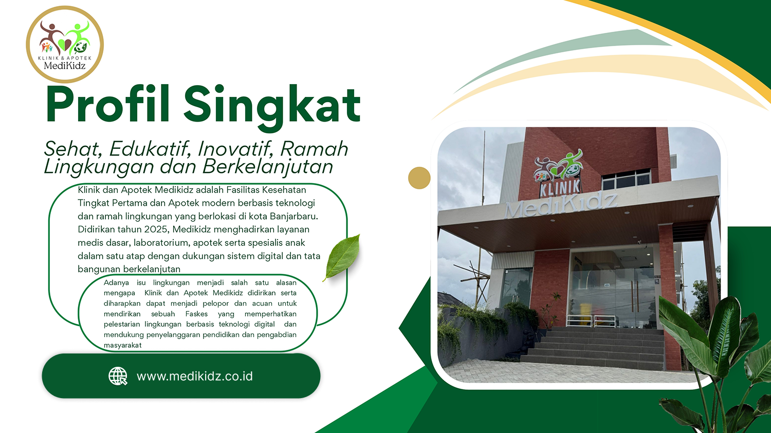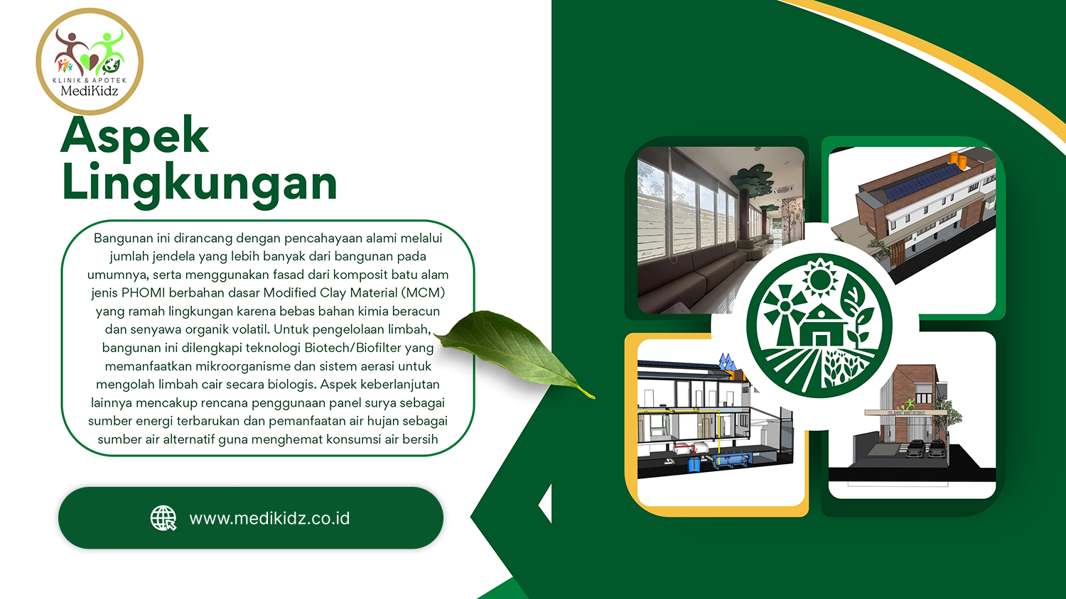 Klinik dan Apotek Medikidz tidak hanya berfokus pada pelayanan kesehatan, tetapi juga peduli terhadap lingkungan. Karena itu, bangunan dirancang dengan konsep ramah lingkungan yang berkelanjutan.