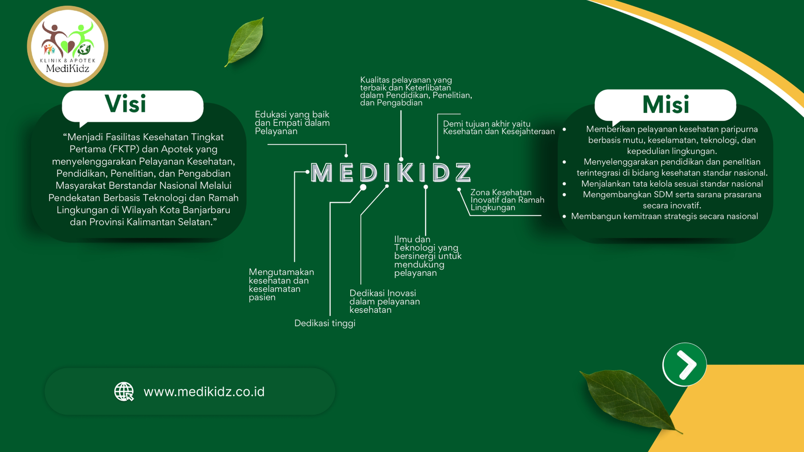 Moto Klinik Pratama dan Apotek Medikidz adalah “Sehat, Edukatif, Inovatif, Ramah Lingkungan, dan Berkelanjutan”. Selain itu, tata nilai dan keyakinan dasar yang dianut oleh Klinik dan Apotek diambil dari nama Klinik dan Apotek yaitu “Medikidz”, dan diuraikan dalam beberapa poin, antara lain: