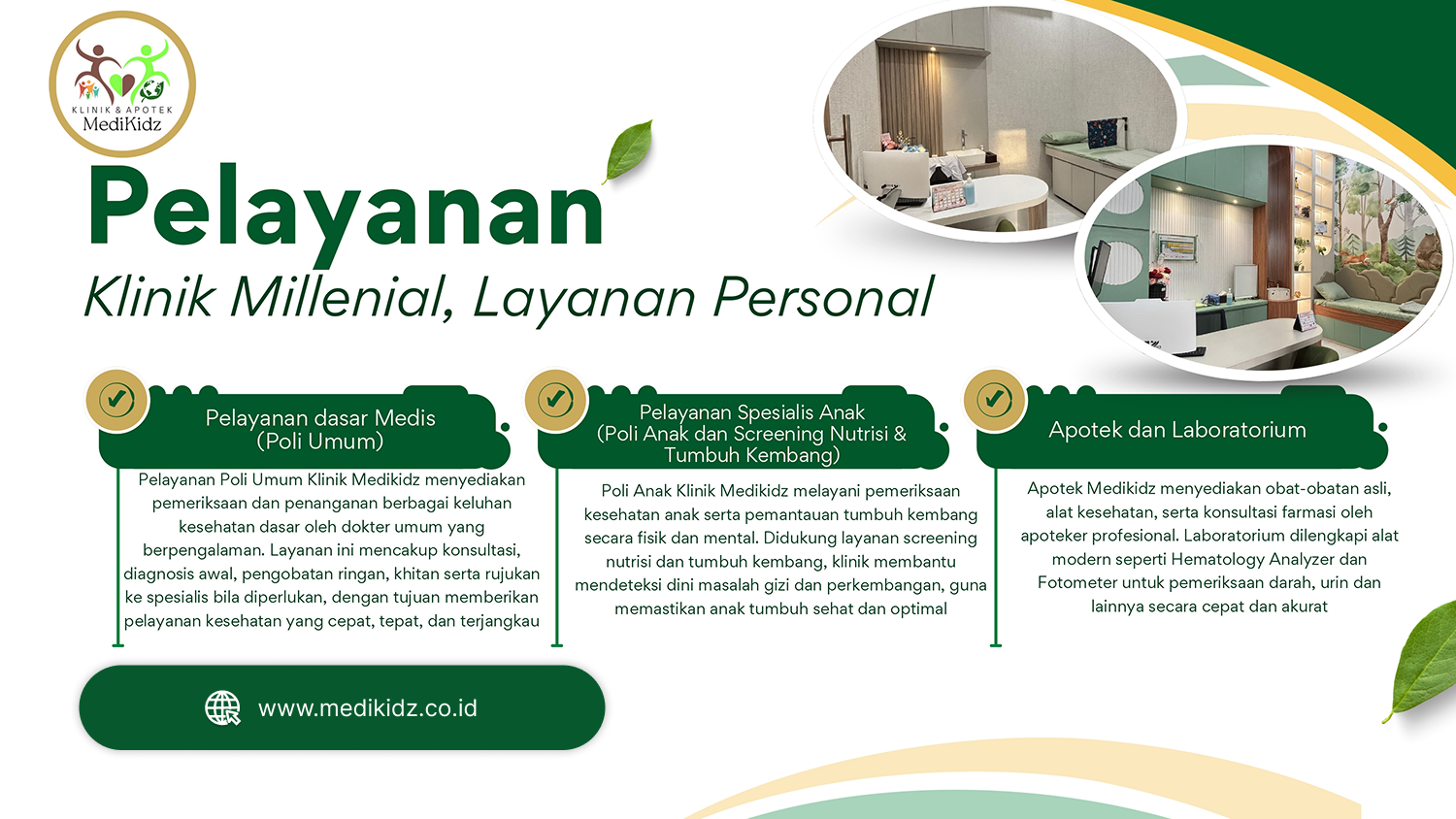 Medikidz hadir dengan layanan kesehatan modern yang mengutamakan kenyamanan pasien melalui pelayanan personal dan profesional. Klinik menyediakan Poli Umum untuk pemeriksaan kesehatan dasar, Poli Anak untuk pemantauan tumbuh kembang serta screening nutrisi, dan Apotek serta Laboratorium dengan obat-obatan asli, layanan farmasi, serta pemeriksaan medis menggunakan peralatan modern.