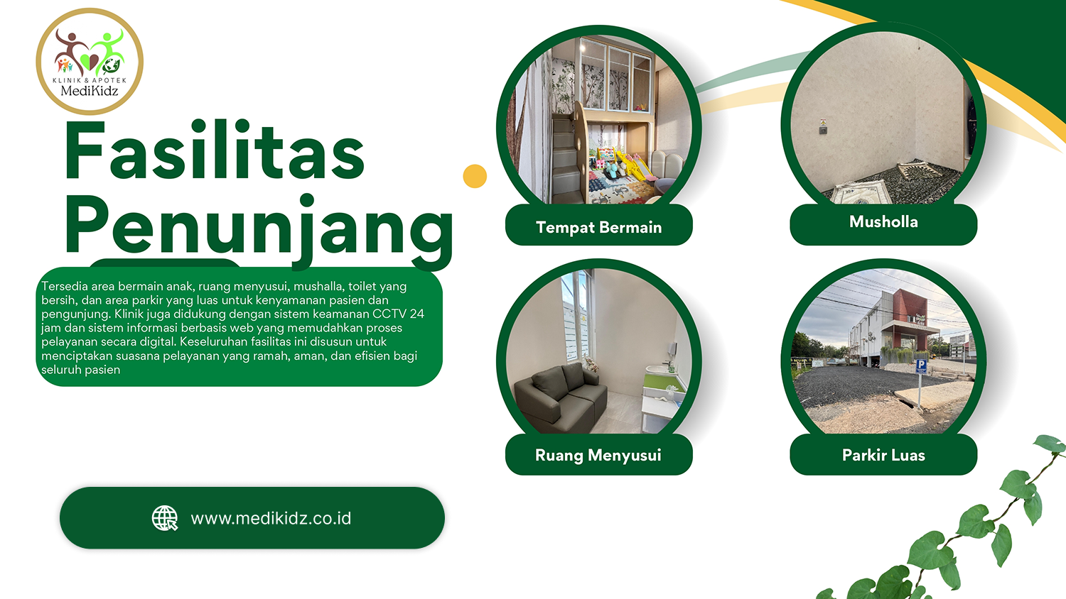 Untuk memberikan pengalaman terbaik bagi pasien dan keluarga, Klinik Medikidz dilengkapi berbagai fasilitas pendukung. Tersedia tempat bermain anak, ruang menyusui, musholla, area parkir luas, serta dukungan sistem keamanan CCTV 24 jam dan layanan digital yang memastikan kenyamanan, keamanan, dan efisiensi pelayanan.