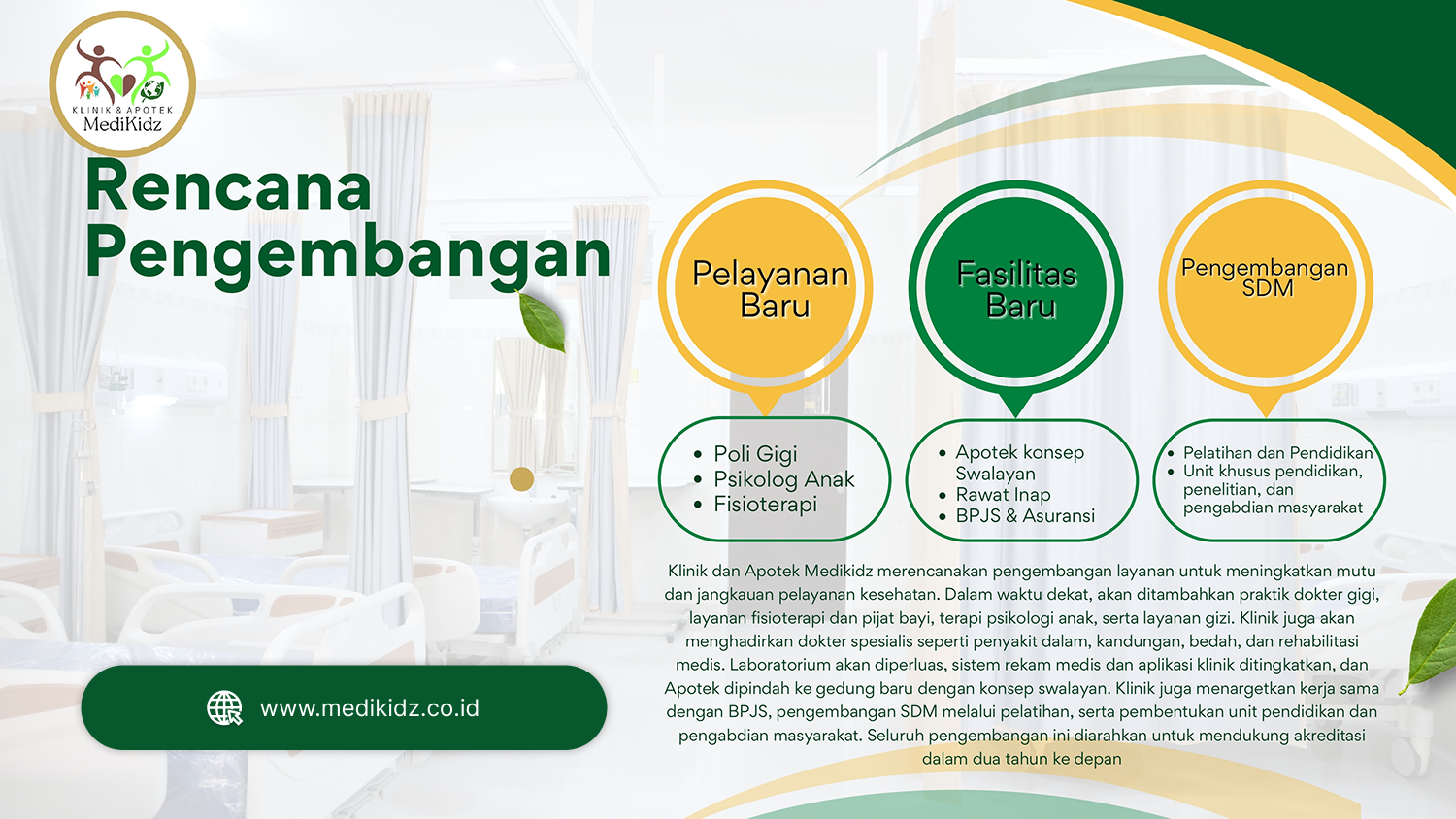 Ke depan, Klinik dan Apotek Medikidz berkomitmen meningkatkan mutu dan jangkauan pelayanan kesehatan. Rencana pengembangan mencakup penambahan layanan baru seperti poli gigi, psikolog anak, dan fisioterapi, menghadirkan fasilitas baru berupa apotek swalayan, rawat inap, serta layanan BPJS dan asuransi, serta pengembangan SDM melalui pelatihan, pendidikan, penelitian, dan pengabdian masyarakat, dengan tujuan mendukung akreditasi dalam dua tahun ke depan.